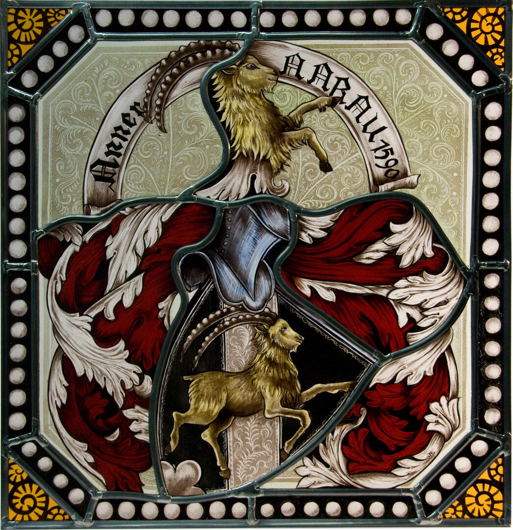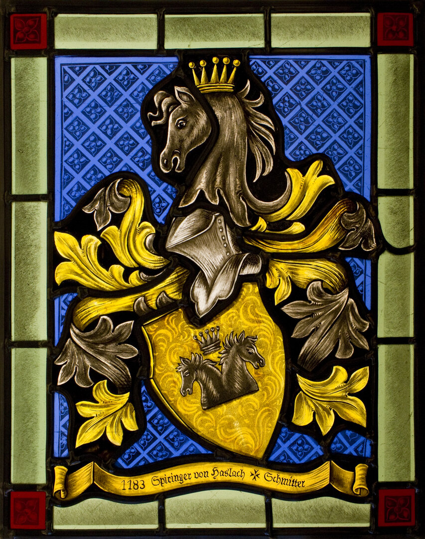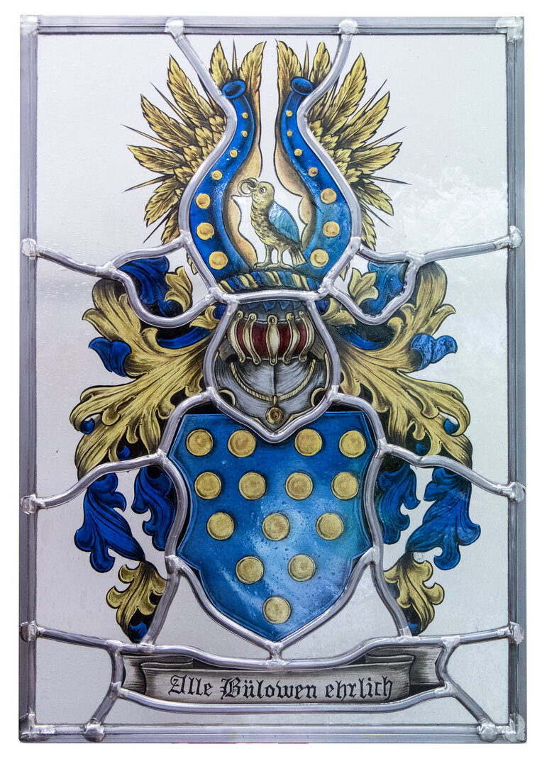 Die Heraldik spielt in der Glasmalerei eine zentrale Rolle. Kundenvorlagen können unabhängig von ihrer Form – sei es als Wappenbrief, überlieferte Abbildung, Siegelring oder eine andere Vorlage – bearbeitet werden.