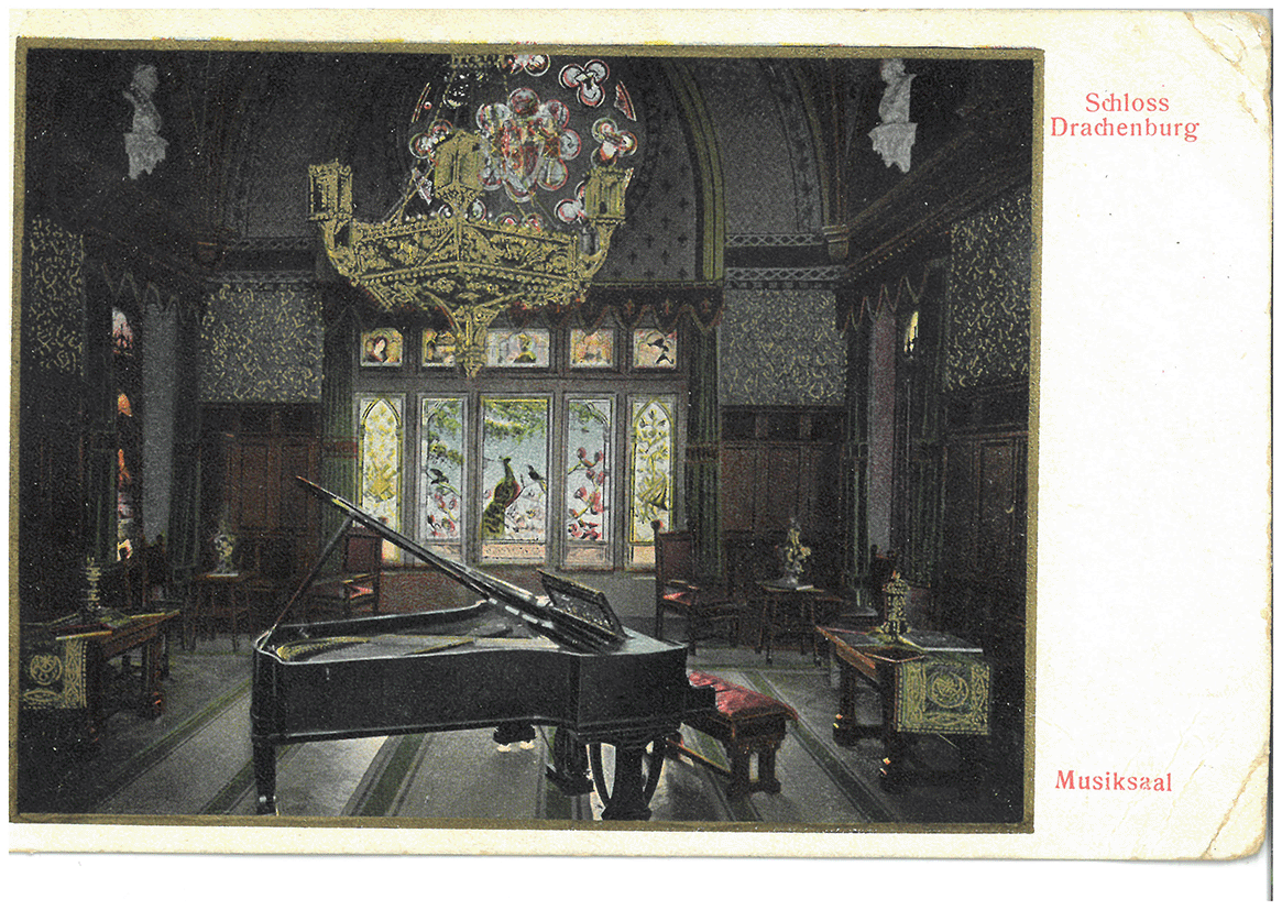 Als Vorlage dienten eine schwarz-weiße und eine colorierte Postkarte. Intensive Recherchen, die in Zusammenarbeit mit Frau Tanja Bleutgen-Wagner, Kunsthistorikerin bei der Schloss Drachenburg gGmbH, durchgeführt wurden, ermöglichten die schrittweise Entwicklung des Entwurfs.